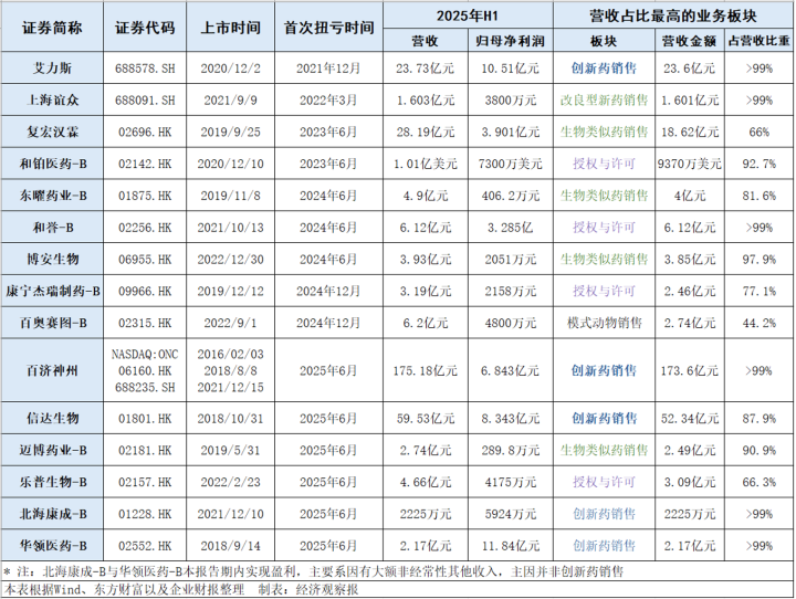 据经济观察报统计,2025年上半年,已有15家企业实现盈利,其中6家企业属于首度扭亏为盈,包括百济神州(ONC.NASDAQ/06160.HK/688235.SH)、信达生物(01801.HK)等头部企业。